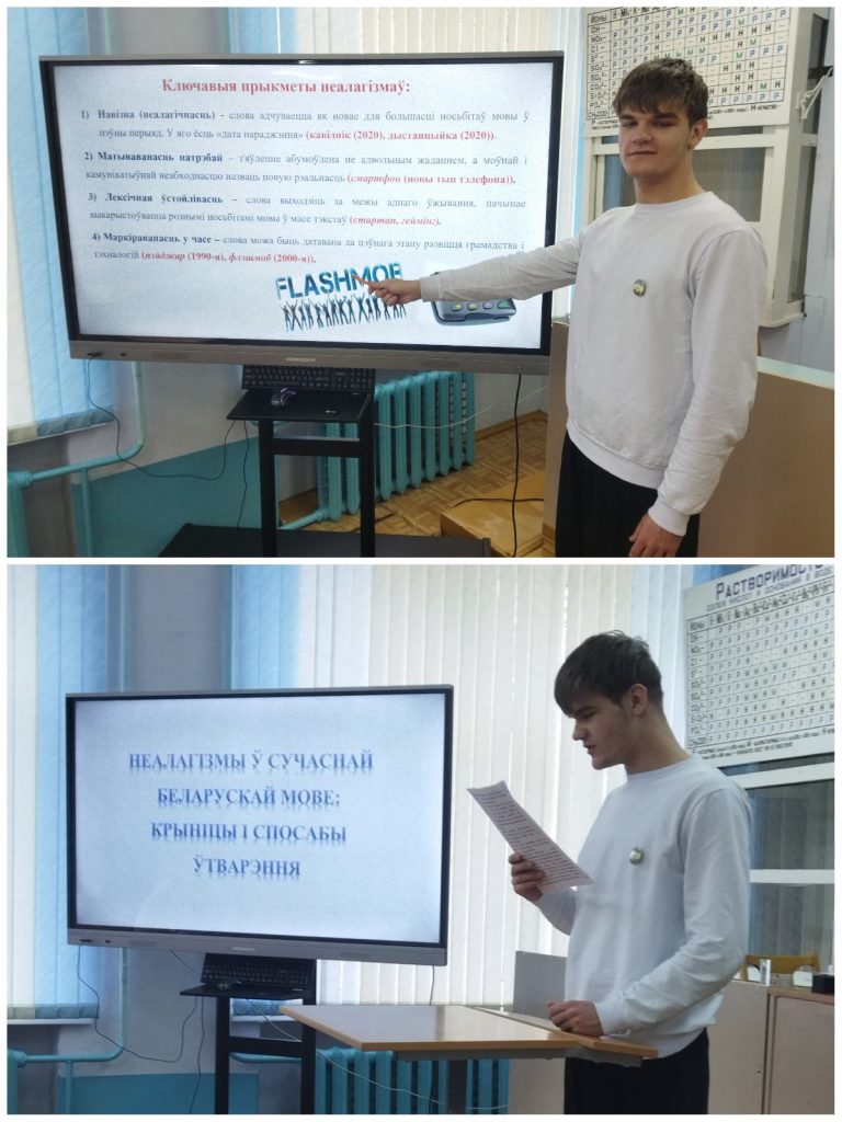 Первый день был посвящён белорусской и русской лингвистике, а также краеведению. Еромченко Елизавета исследовала эвфемизмы в речи учителей нашей школы. Гречихо Никита раскрыл тайны образования неологизмов в белорусском языке. Новикова Наталья обратила внимание на интерференционные ошибки в речи учащихся. Дайнеко Мелисса в своем исследовании узнавала, можно ли словом ранить или вылечить.