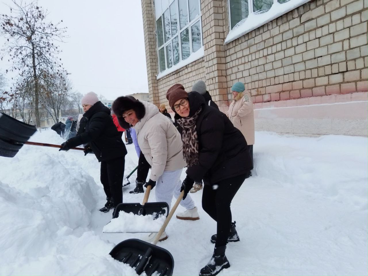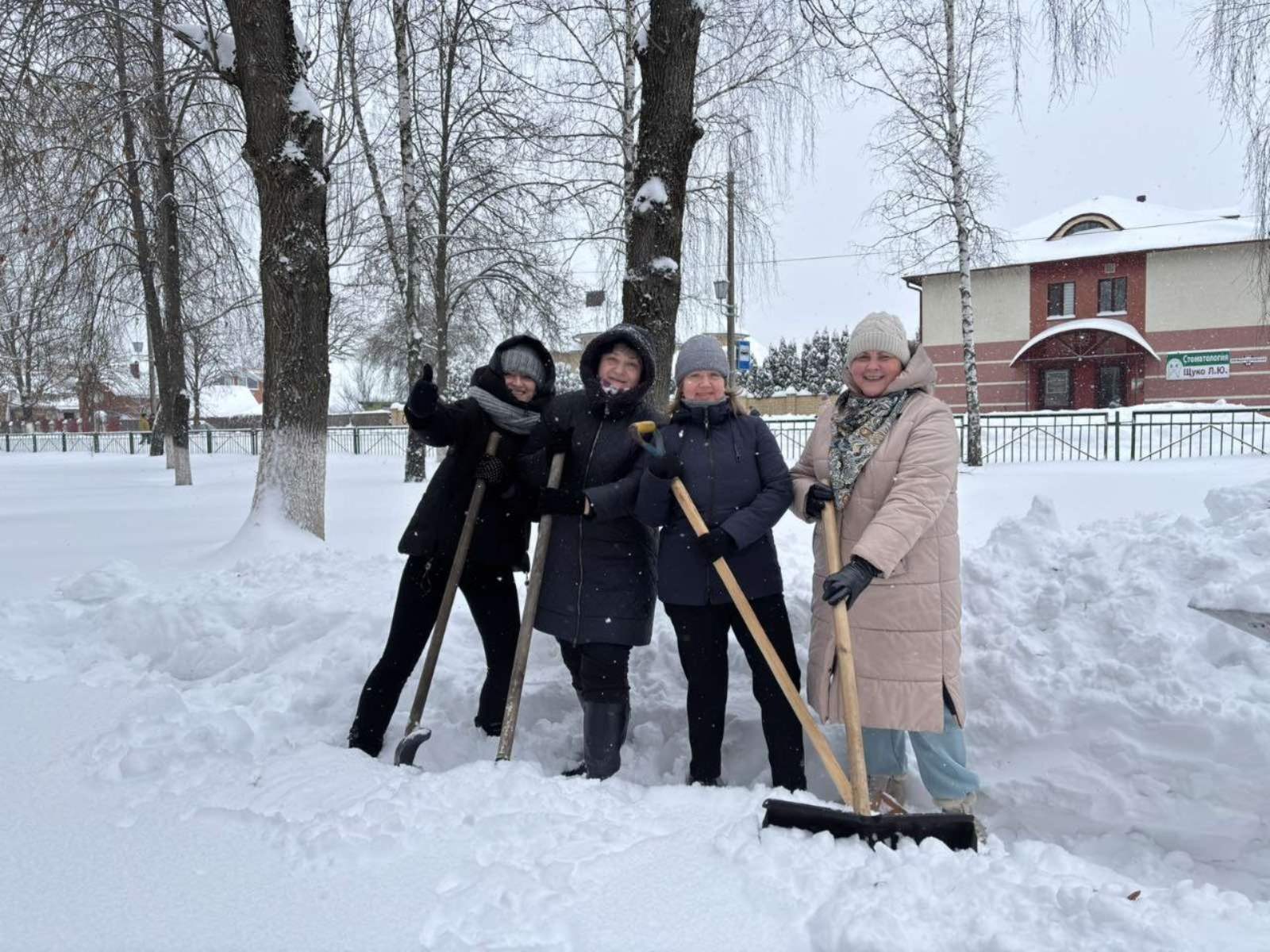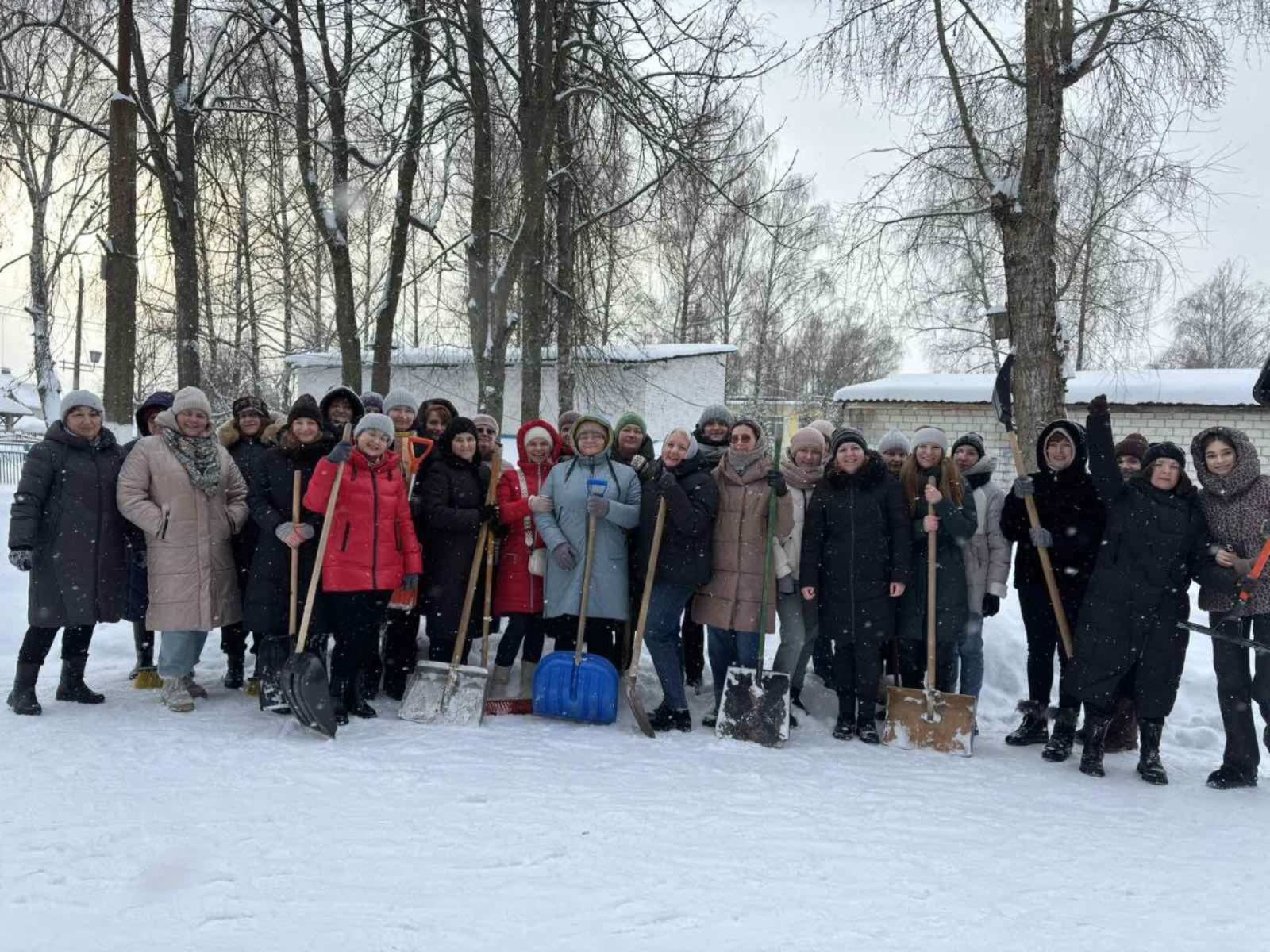 Дружный коллектив вышел на субботник по очистке территории школы от зимнего снежного покрова.