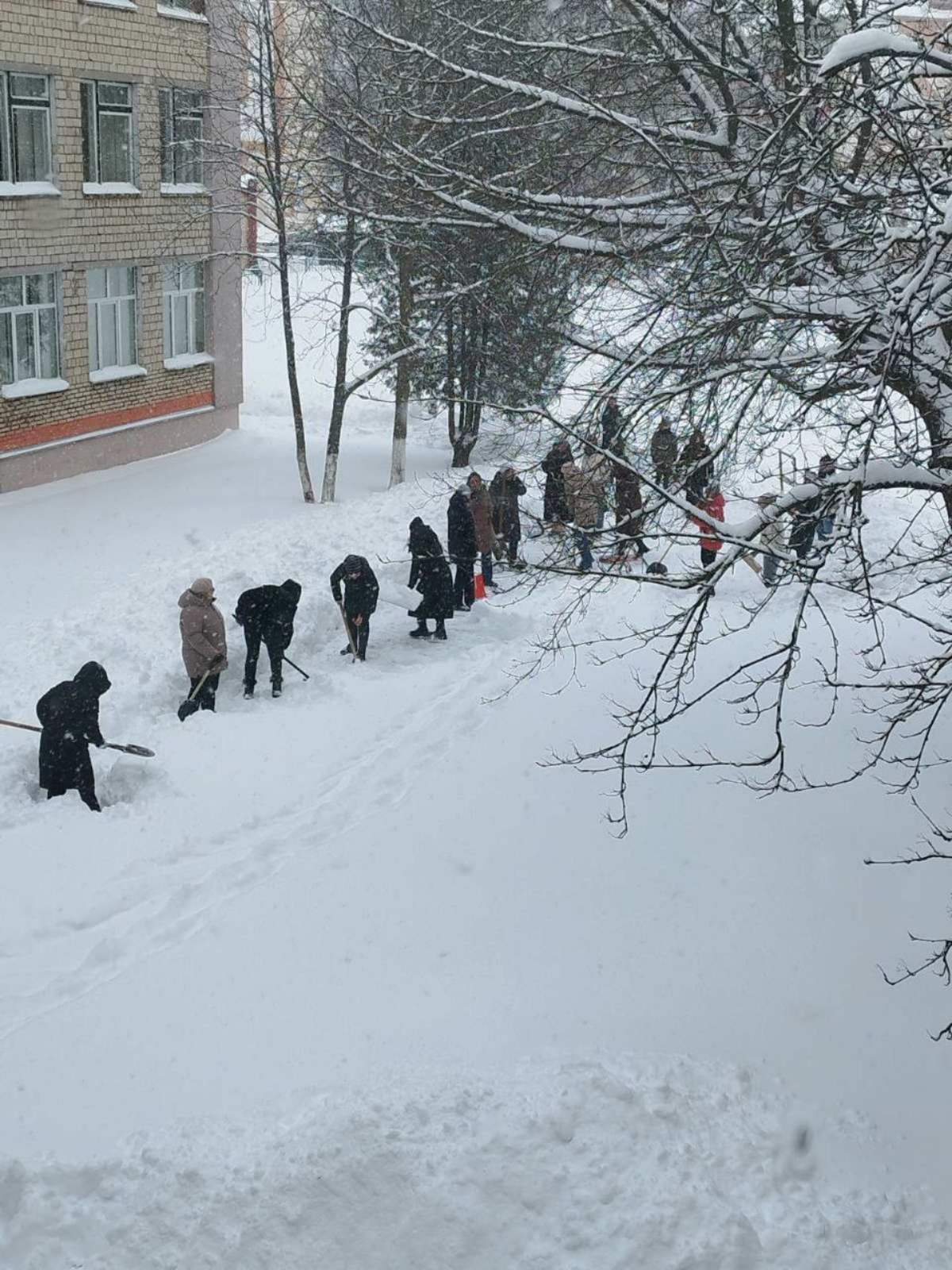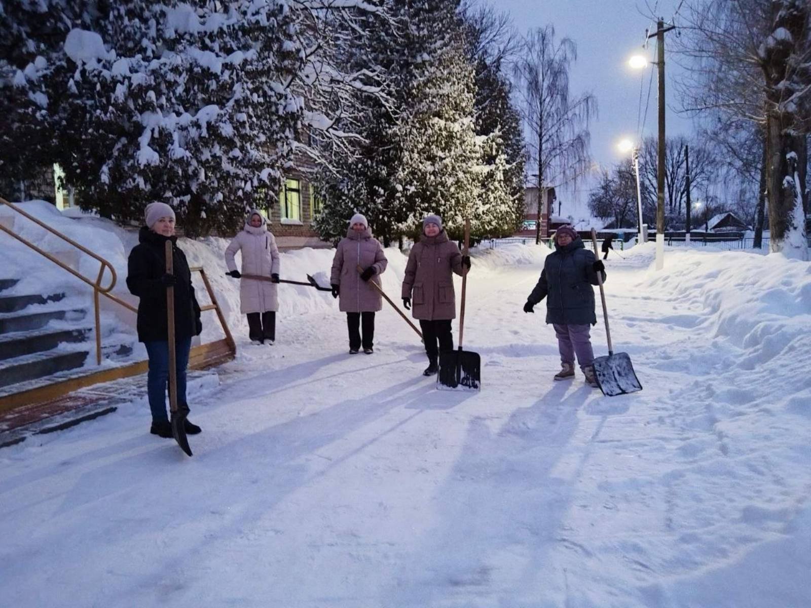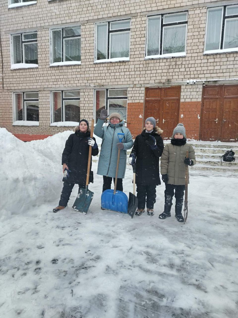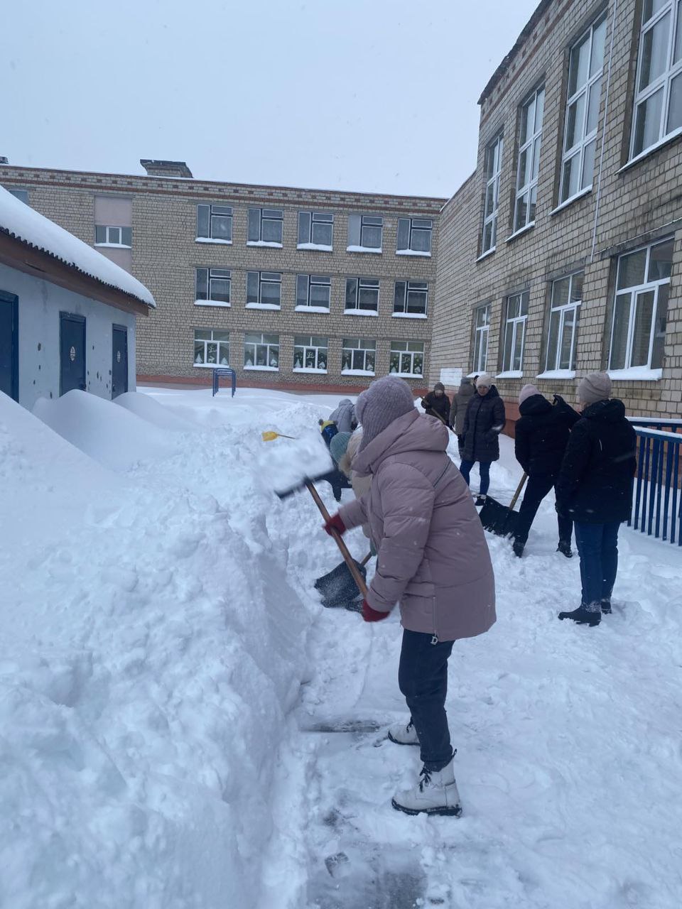 Дружный коллектив вышел на субботник по очистке территории школы от зимнего снежного покрова.