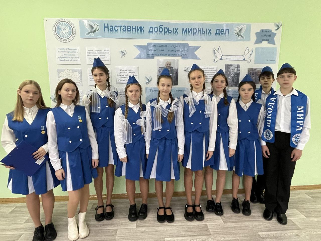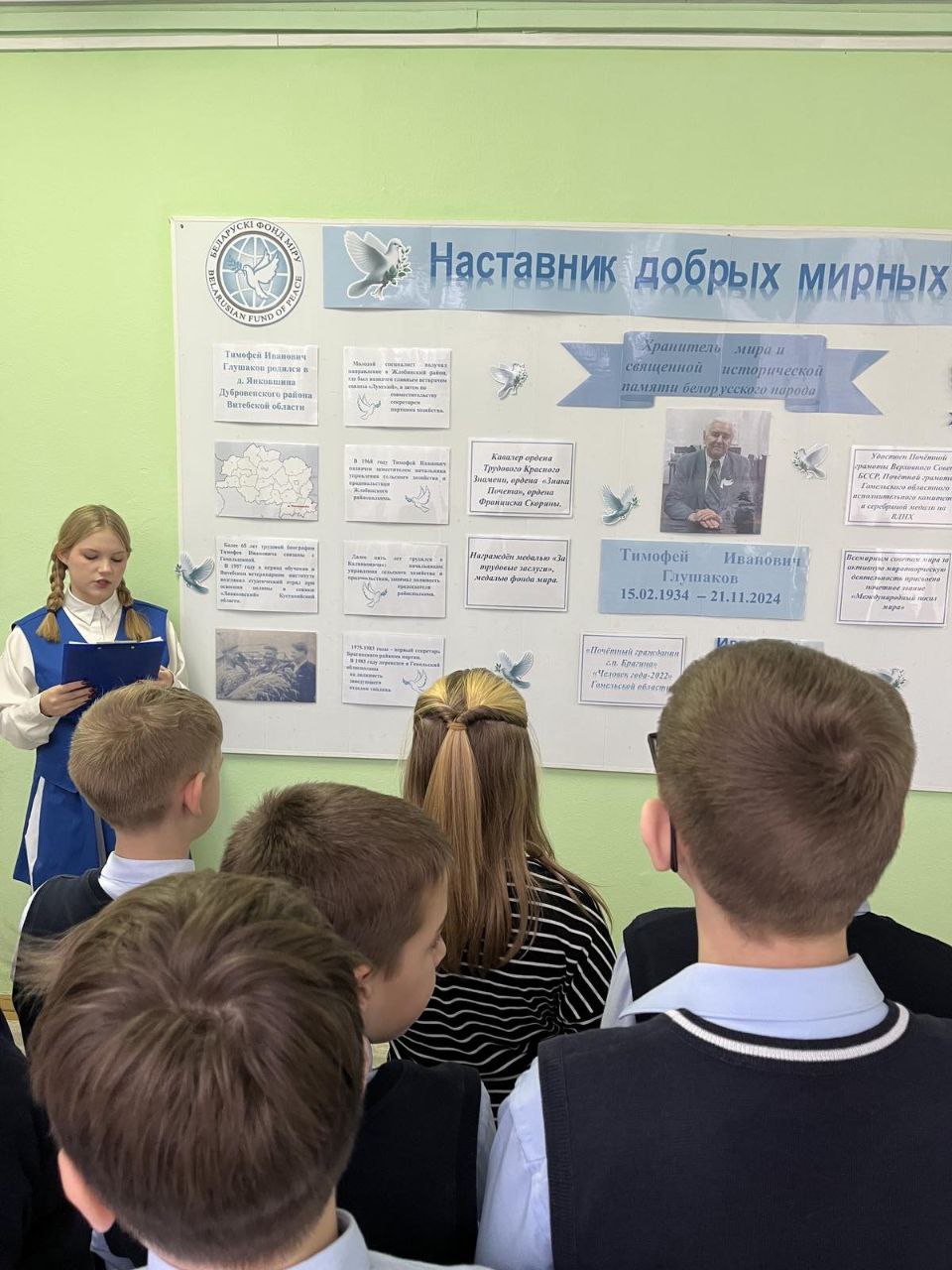 В средней школе № 9 г. Жлобина, школе Мира, прошли уроки памяти «Наставник мирных добрых дел». Эти уроки подарили нам не просто воспоминания, а живой завет. Они напомнили, что даже один человек, посвятивший себя миру, способен стать путеводной звездой для многих. Память о Тимофее Глушакове, как символ доброты, единства и созидания, теперь служит нам компасом. И на этом пути мы даем себе слово: памяти этой мы будем достойны! Ведь именно в наших руках теперь продолжение его «мирных добрых дел».